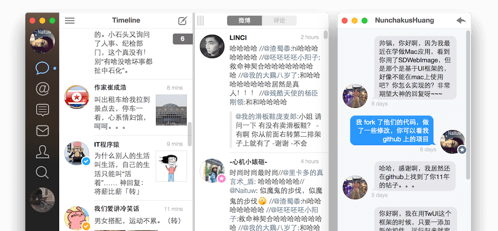 提及、评论、私信都会及时通过系统通知中心显示在你的屏幕右上角,让你在工作的同时也不错过任何好友与你的互动。甚至,你还可以直接从通知中回复好友的信息(Mavericks之后系统支持)。